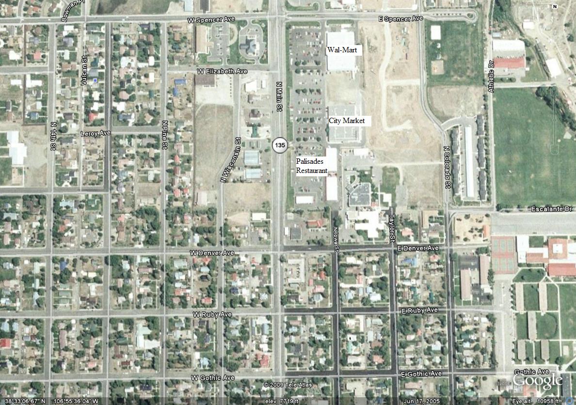The Palisades Restaurant is located at 820 North Main Street in Gunnison. It is situated in front of City Market. Click on the following image for a larger view.