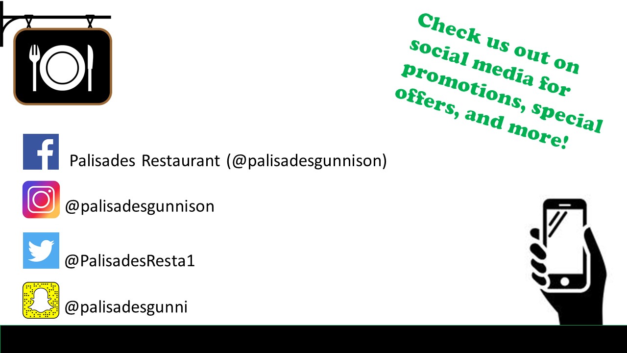 For more than 14 years the Palisades Restaurant and Saloon has been a fixture in the Gunnison valley, providing great, affordable meals to locals and visitors alike. The owner, Scott Frazier, invites you to enjoy a wide selection of American cuisine (check out our Menu page) in the wonderful atmosphere of the west. Children are always welcome, with a menu designed just for them. Bring the whole gang to Palisades where there's a lot of room and a friendly staff to take care of all your dining needs.